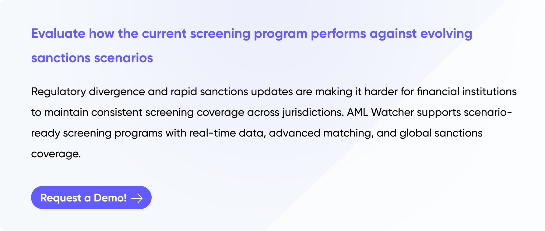 Compliance teams managing multi-jurisdictional sanctions exposure often lack the infrastructure required for adaptive screening. AML Watcher supports dynamic screening with real-time data, expanded alias coverage, and scenario-driven capabilities that align with evolving regulatory expectations.