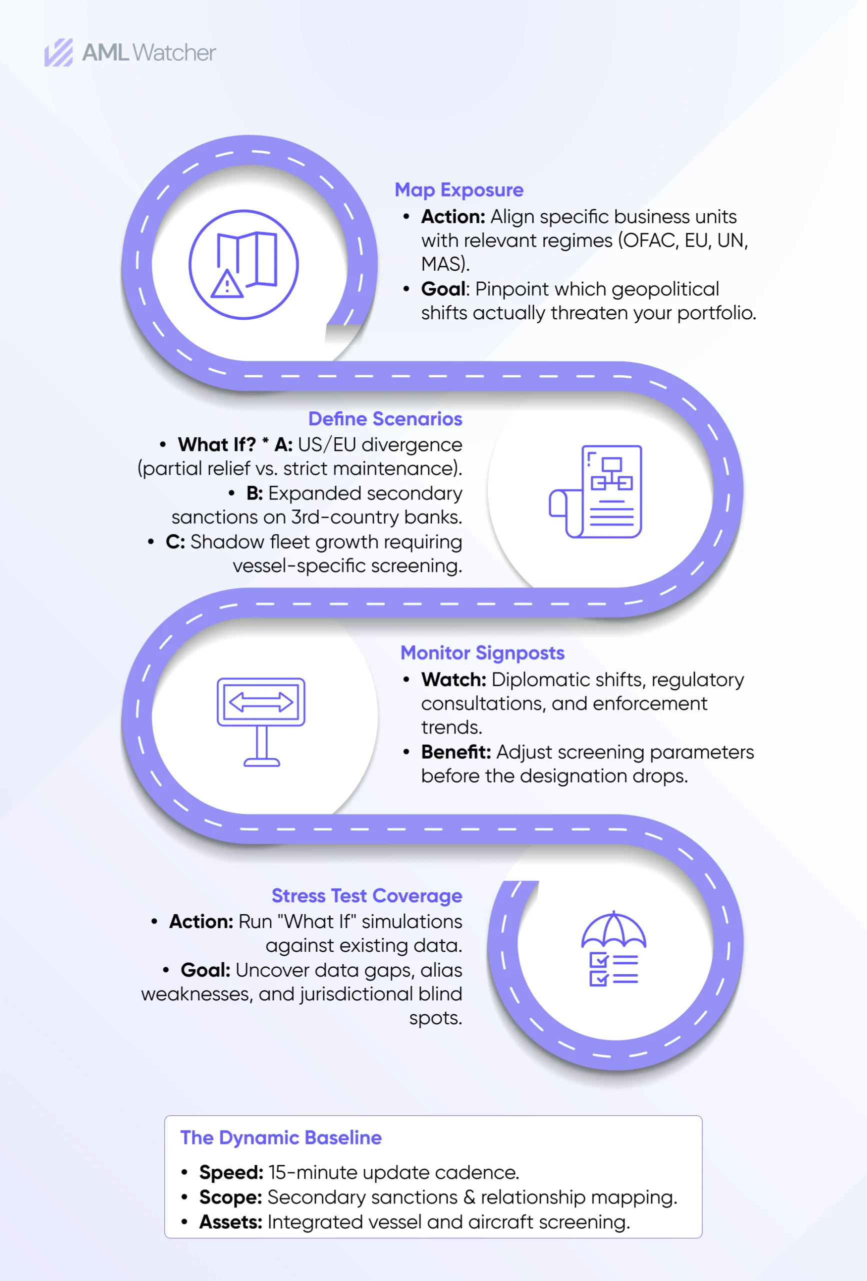 Scenario planning works on plausible, not certain, futures. For a bank with Russia exposure today, relevant scenarios include: partial US-Russia sanctions relief with no EU equivalent (already partially underway), EU expansion of secondary sanctions to additional third-country financial intermediaries (already precedented with the Chinese bank designations), and continued shadow fleet expansion with vessel screening obligations in trade finance. Each scenario requires a distinct compliance response.