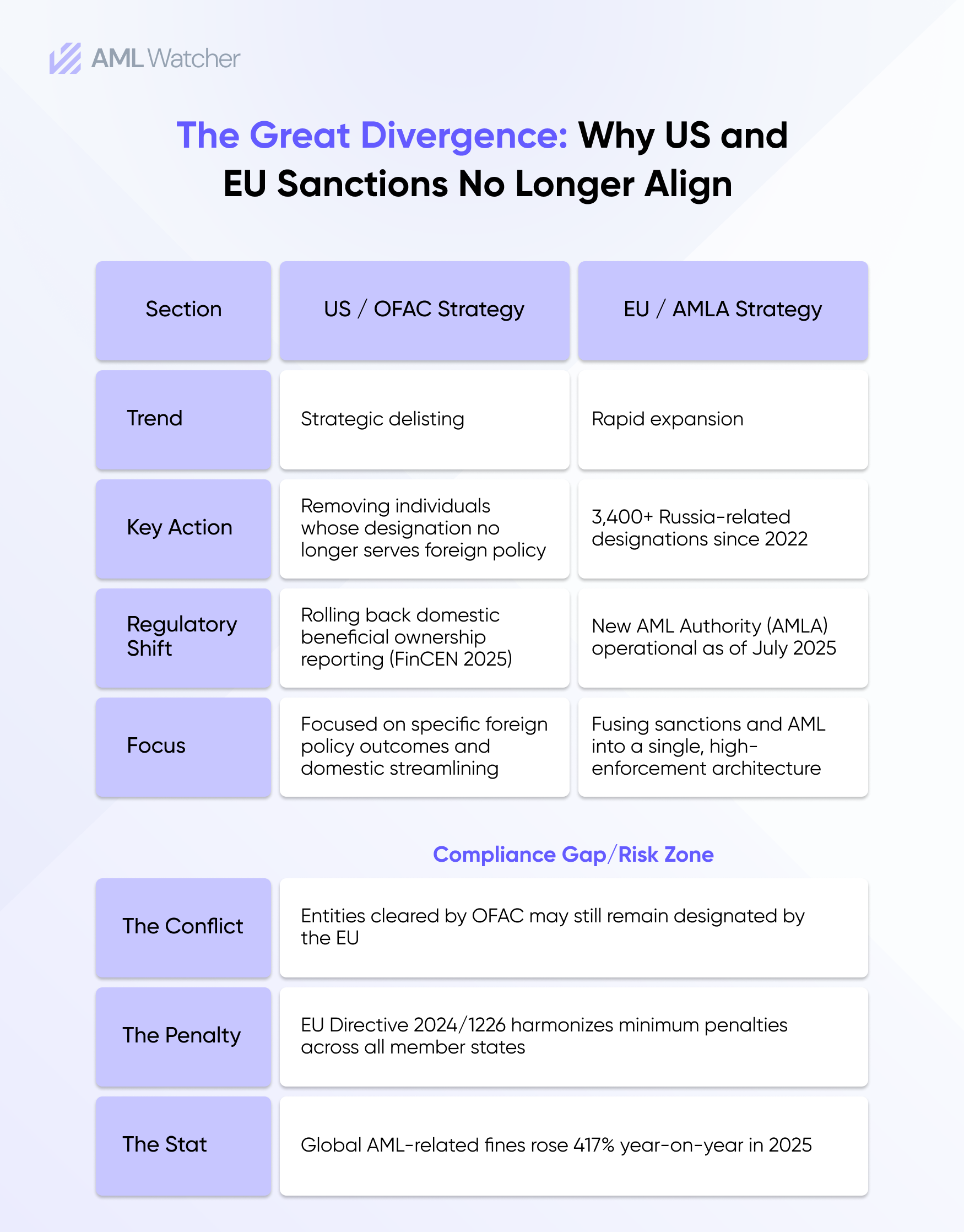 For a multinational bank or FinTech operating under both frameworks, this creates a compliance problem with no clean resolution. An entity cleared by OFAC may remain designated by the EU. A transaction permissible under US law may expose a firm to EU Directive 2024/1226 penalties, which now carry harmonized minimums enforced across member states. In the first half of 2025, global AML-related fines rose 417% year-on-year. Jurisdictional misalignment is no longer a theoretical risk.